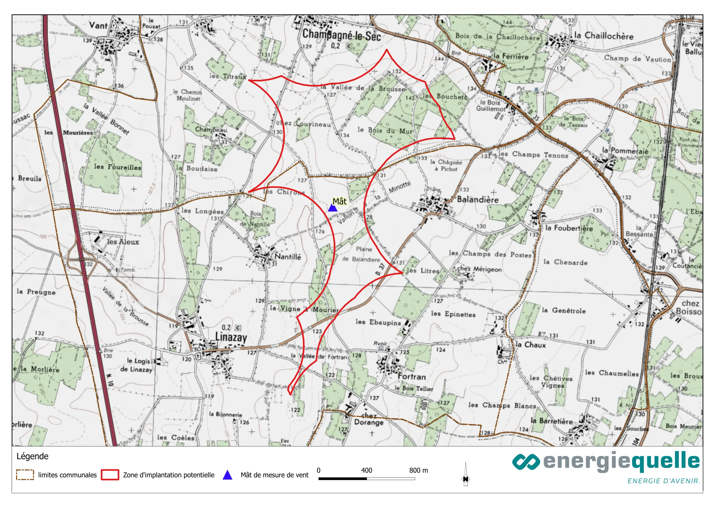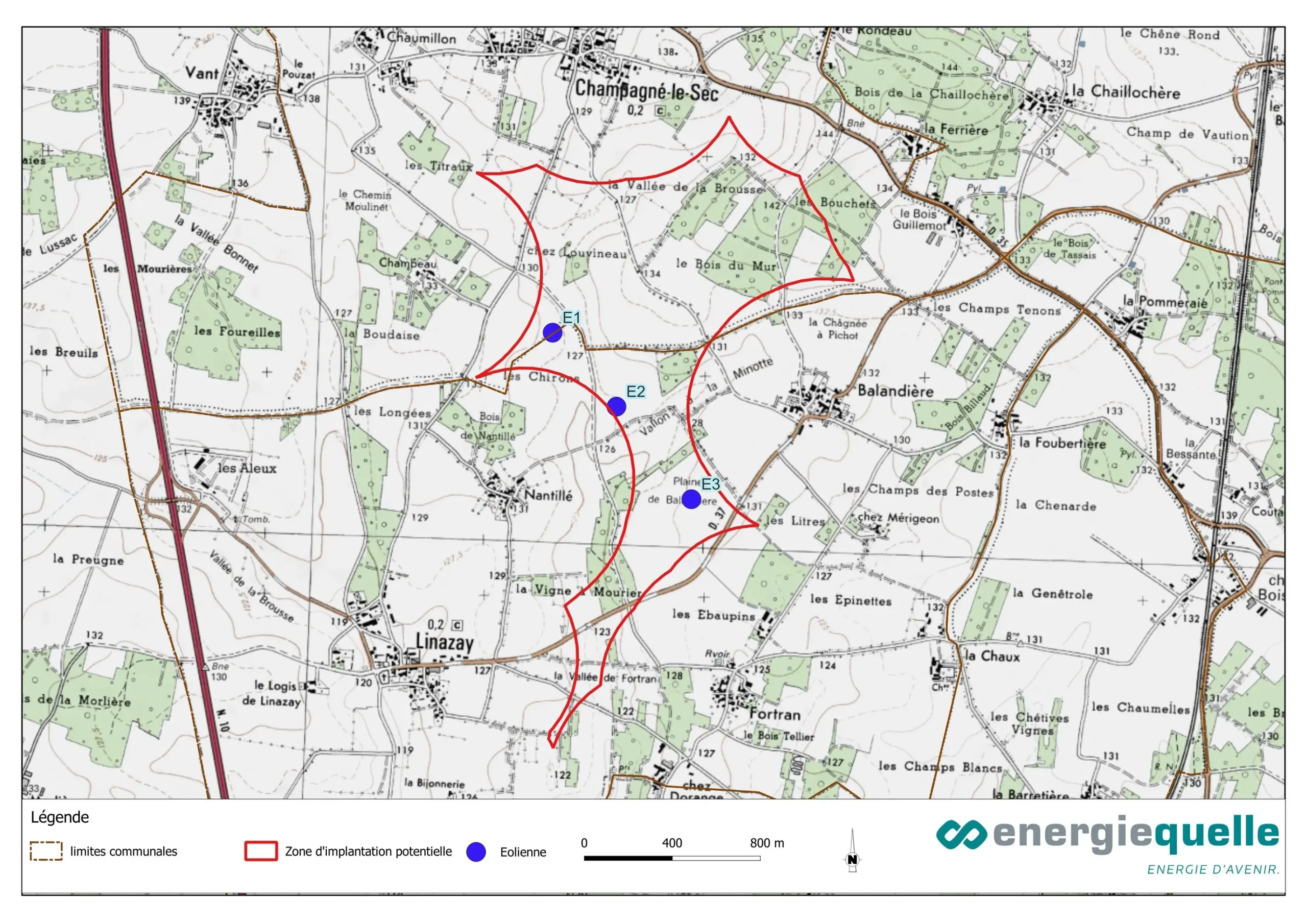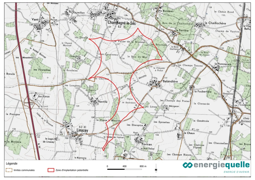 La zone d’implantation potentielle (ZIP) du projet éolien de La Balandière est située à environ 45 km au sud-ouest de Poitiers. Elle est localisée sur les communes de Champagné-Le-Sec et de Linazay, toutes deux rattachées à la communauté de communes du Civraisien en Poitou.
