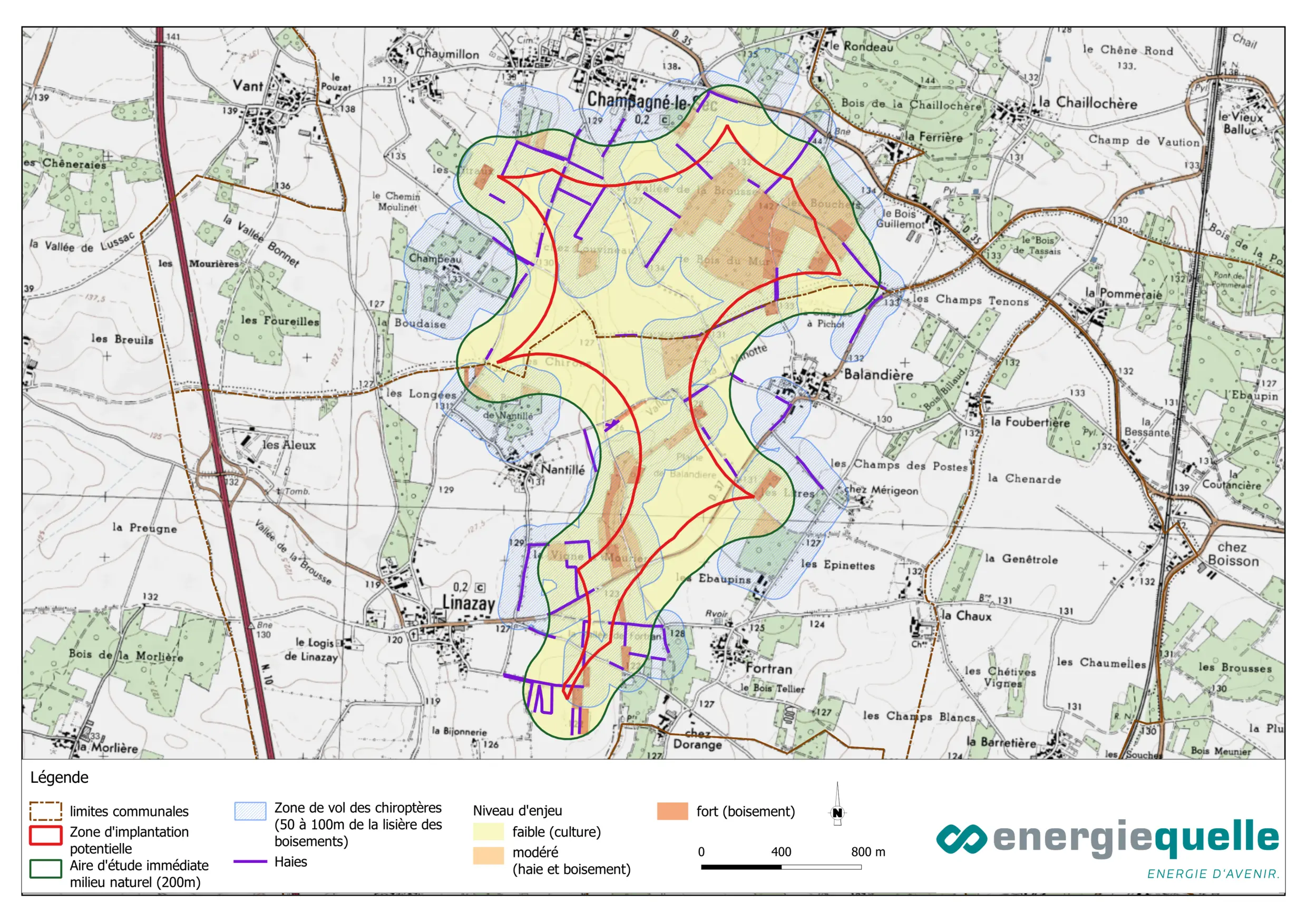 Les inventaires ont été réalisés de 2021 à 2022. L’ensemble des enjeux identifiés a été présenté lors d’une permanence d’information en janvier 2023. Vous trouverez ci-dessous une carte les présentant. Par ailleurs, un suivi de l’activité en hauteur des chiroptères a été effectué de mars à novembre 2023, avec la mise en place de micro-enregistreurs sur le mât de mesure de vent.