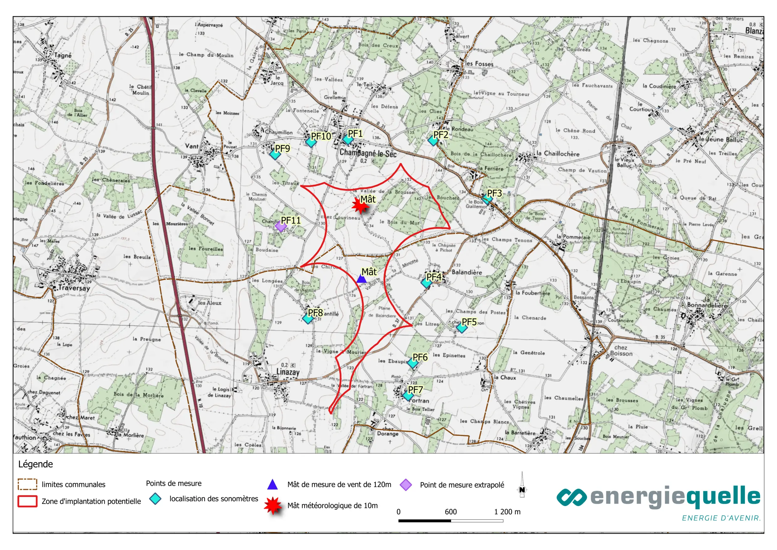 10 points de mesures acoustiques répartis autour de la zone étudiée à proximité des habitations ont permis d’enregistrer en continu les ambiances sonores durant 17 jours du 22 janvier au 7 février 2024. Cet état initial sonore, corrélé aux mesures issues de l’étude de vent et aux données techniques de différents modèles d’éolienne étudiés a permis au bureau d’étude EREA de vérifier en amont le respect de la réglementation acoustique française. S’il apparait un risque de non-conformité à cette réglementation, le fonctionnement des éoliennes serait alors adapté de façon à réduire l’émergence sonore émise par ces dernières.